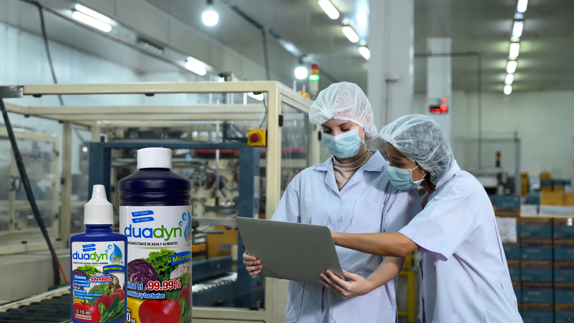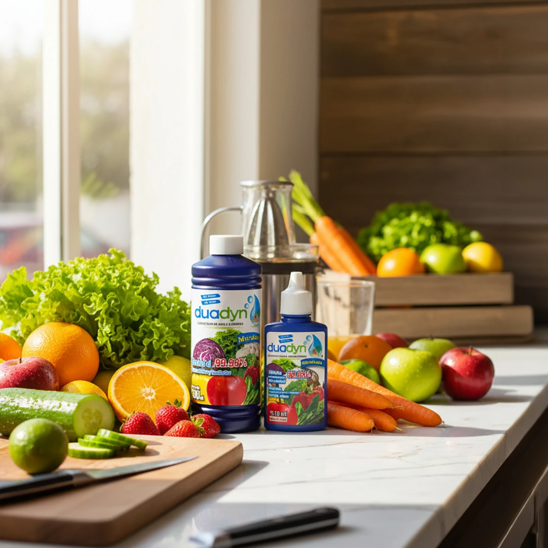 Duadyn es un desinfectante para frutas y verduras formulado con plata coloidal, diseñado para eliminar hasta el 99.9% de bacterias de forma segura. Su aplicación no altera el sabor, olor ni la calidad de los alimentos, permitiendo una desinfección efectiva tanto en el hogar como en entornos profesionales.